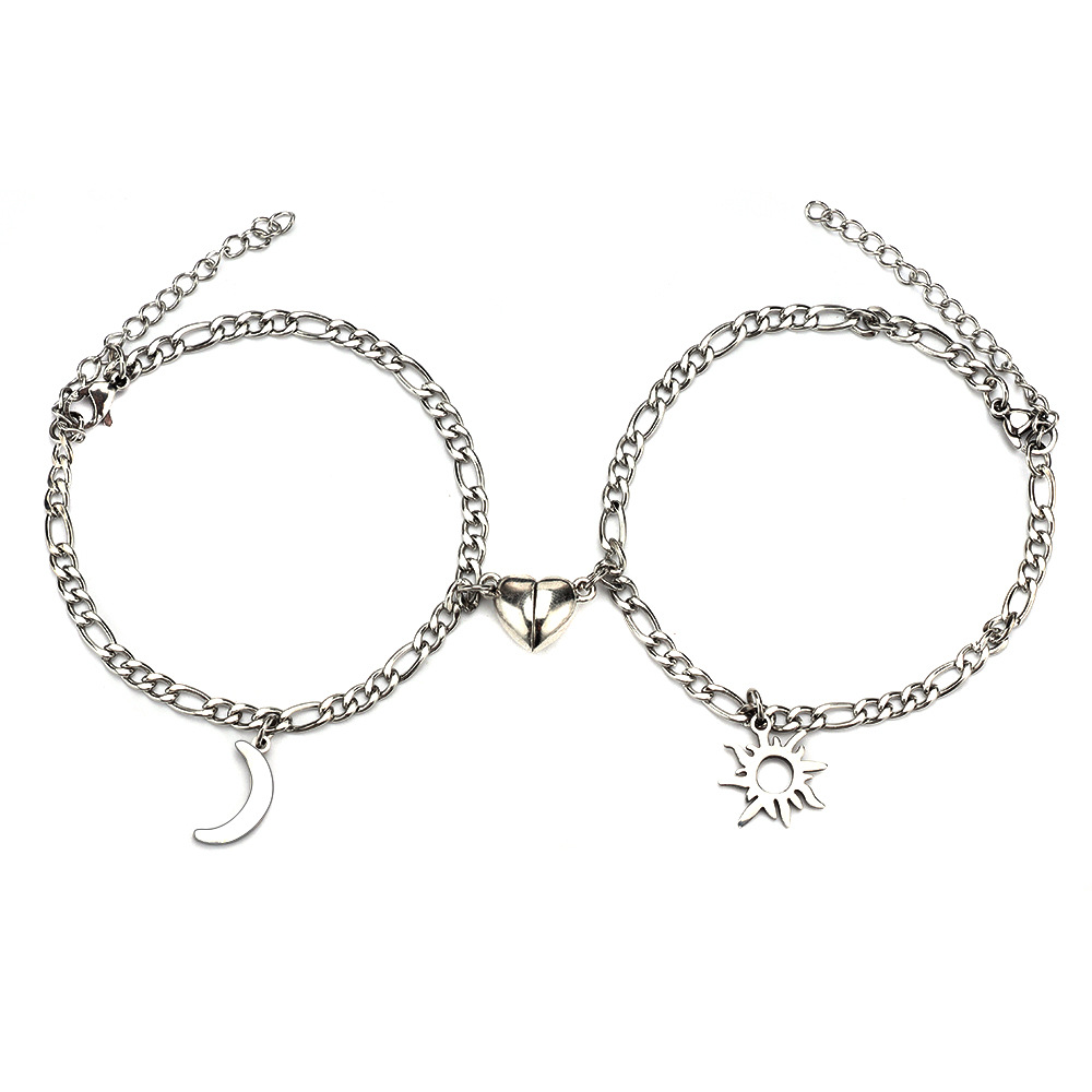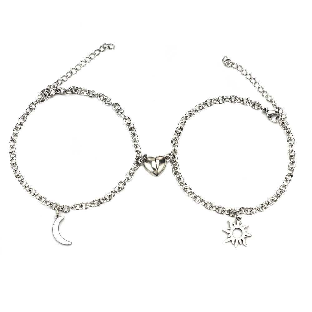 Quality is paramount in the design and manufacture of the Stainless Steel Sun Moon Charm Magnet Attraction Bracelets. The use of titanium steel ensures that these bracelets are not only aesthetically pleasing but also resistant to wear and tear, making them suitable for everyday use. The craftsmanship involved in their creation guarantees that they will stand the test of time, maintaining their charm and integrity even with regular use. Furthermore, the materials used meet high-quality standards, assuring customers of their reliability and performance. These bracelets are designed to withstand the rigors of daily wear while providing a comfortable fit. The attention to detail in their manufacturing process underscores a commitment to excellence, ensuring that each piece is not just an accessory but a lasting keepsake.