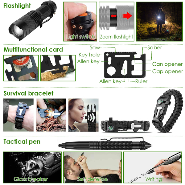 • Complete Survival Kit: This 47-piece emergency survival kit includes everything you need for outdoor activities, such as a military knife, multifunctional spoon, tactical pen, flashlight, compass, rain poncho, emergency blanket, and more. First aid supplies are also provided to help you address wounds promptly and prevent infection.