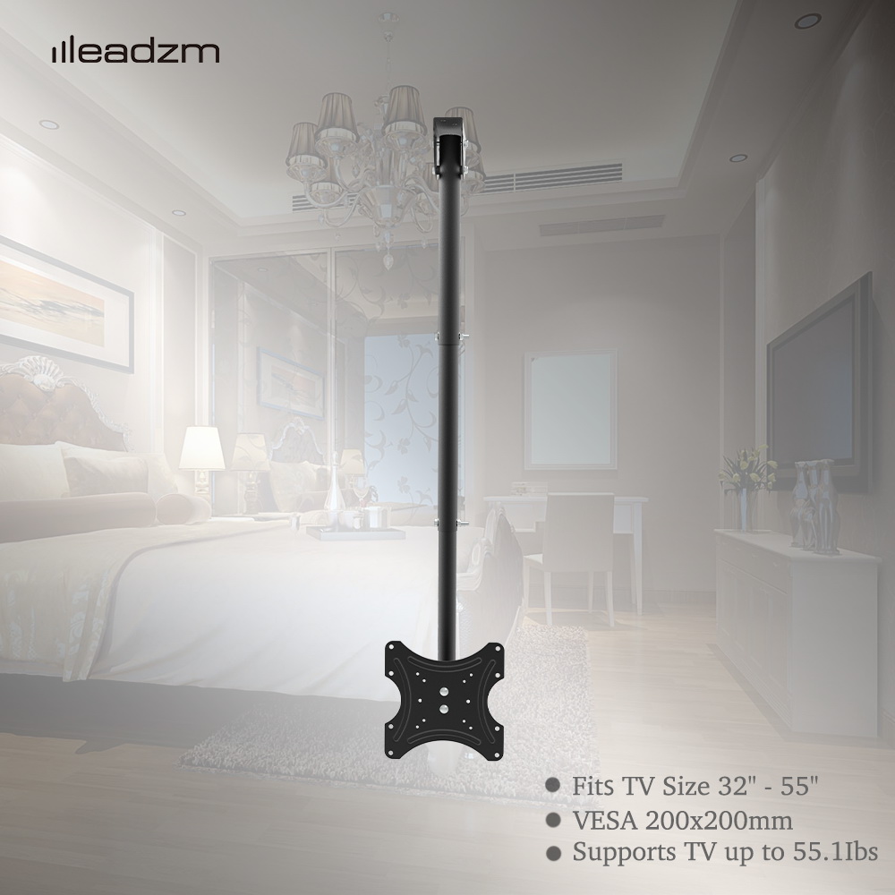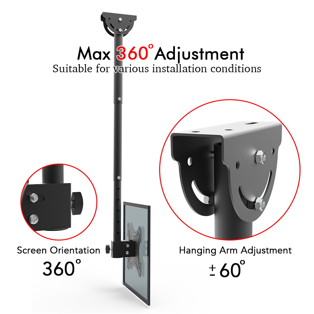 The Adjustable TV Ceiling Bracket is a versatile mounting solution designed to accommodate a wide range of televisions and monitors, specifically those between 32 to 55 inches in size. This product is particularly beneficial in various environments where wall space may be limited or where an elevated viewing experience is desired. Ideal application scenarios include bars, restaurants, fitness centers, waiting areas, and medical offices such as dentist and doctor clinics. Additionally, this ceiling mount is suitable for use in garages, grocery stores, family rooms, and any other setting that requires optimal screen positioning. The adjustable height feature allows for customized installation, ensuring that the television can be positioned at the perfect eye level for viewers, enhancing the overall viewing experience. With its multi-directional capabilities, including a 360-degree swivel and a tilt range from 5 to 15 degrees, this product is versatile enough to meet the needs of various industries and settings, making it a practical choice for both commercial and residential applications.