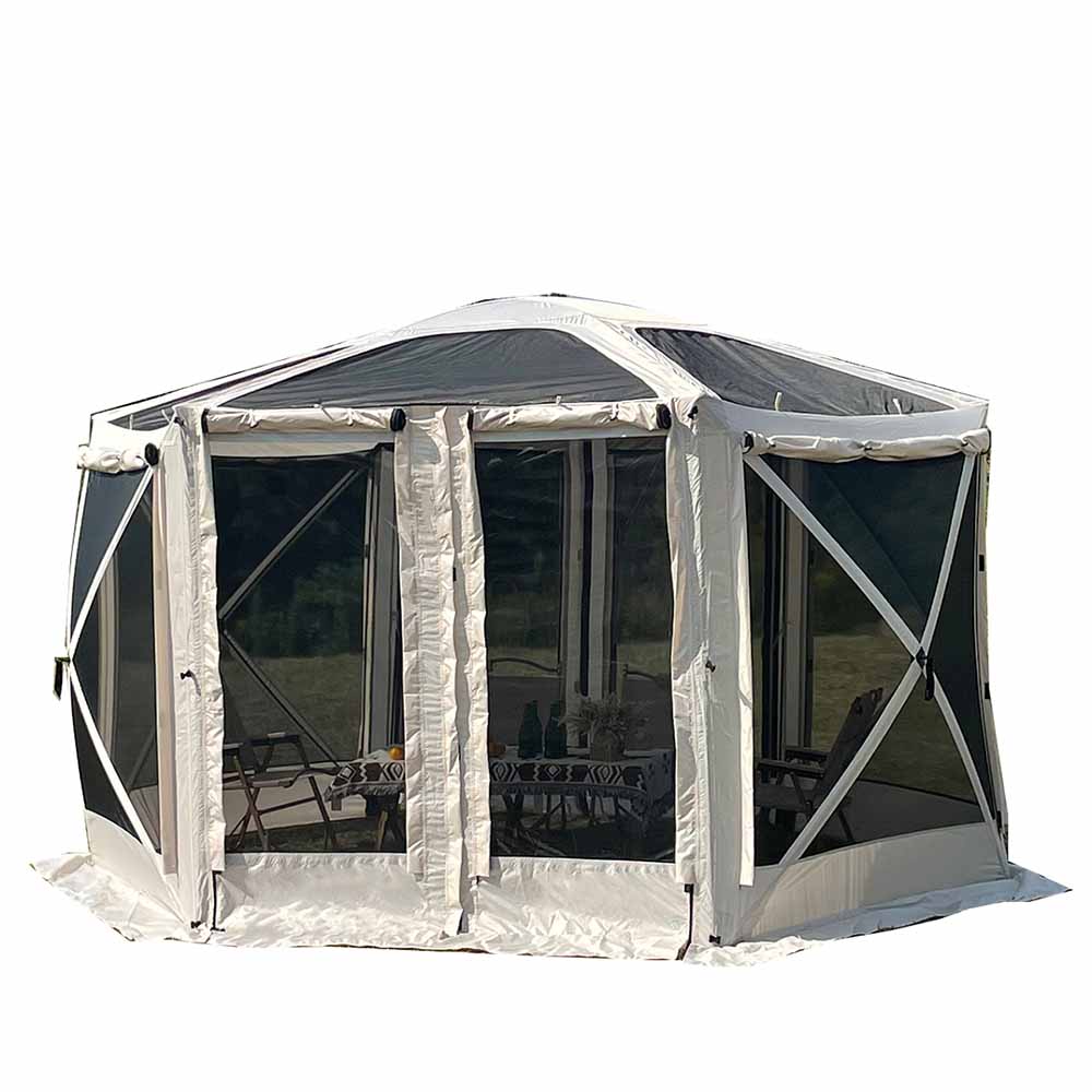 Quality is a defining characteristic of the Automatic Hexagonal Screen House Gazebo Tent, as it is built with meticulous craftsmanship and high-grade materials. The tent’s structure is supported by robust fiberglass poles, ensuring stability and durability against various weather conditions. The Oxford fabric used is not only water-resistant but also robust enough to withstand wear and tear from outdoor use.