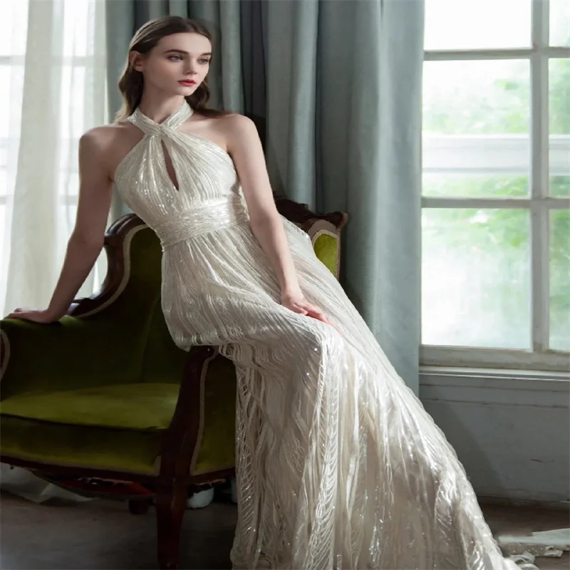 The Champagne Color Host Starry Sky Toast Halter Dress is a stunning piece designed primarily for catwalk shows, special events, and formal occasions. This versatile dress can also be worn at weddings, galas, and other high-profile events where making a grand impression is essential.