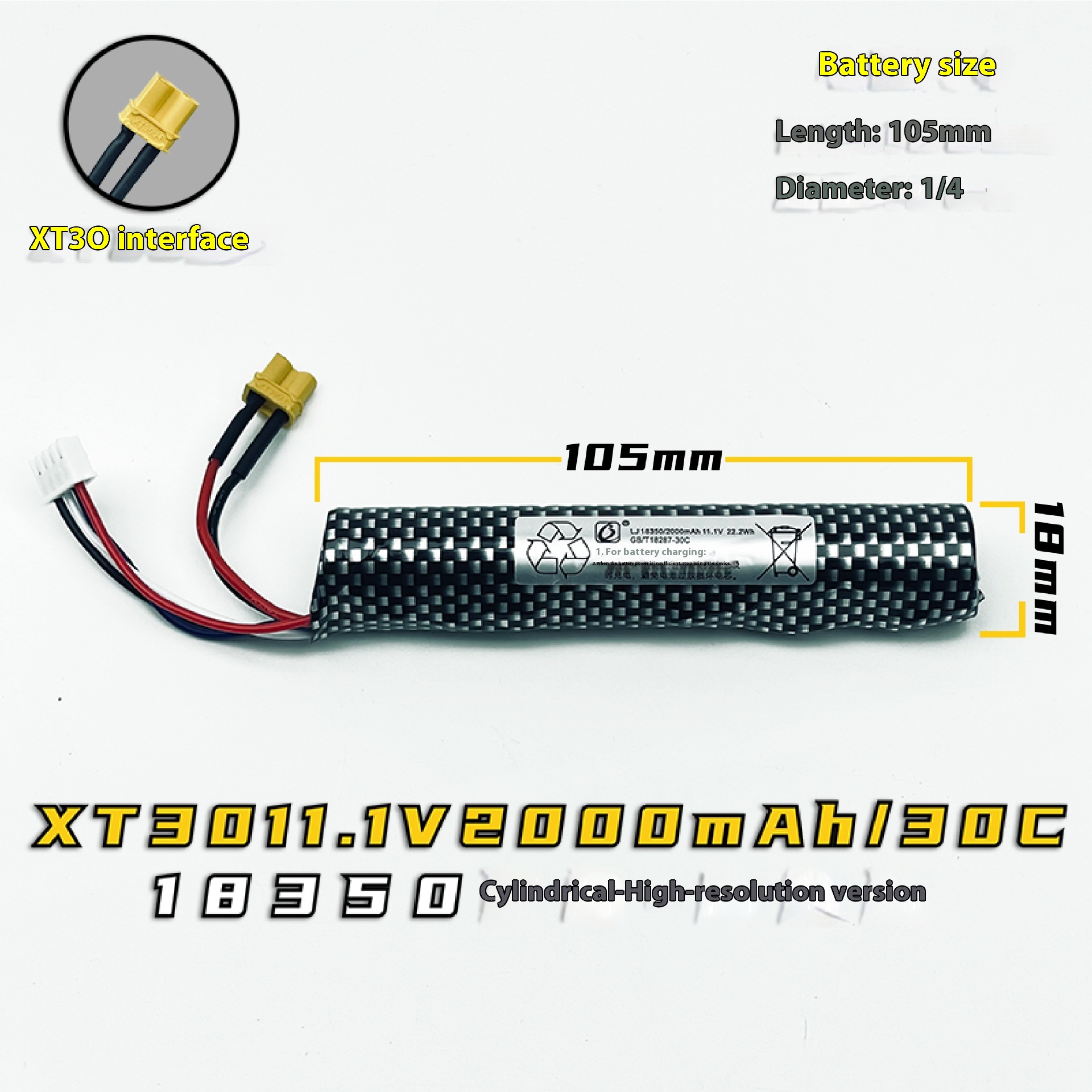 11.1V cylindrical 18350 high discharge version battery – XT30 2000mAh/30C,