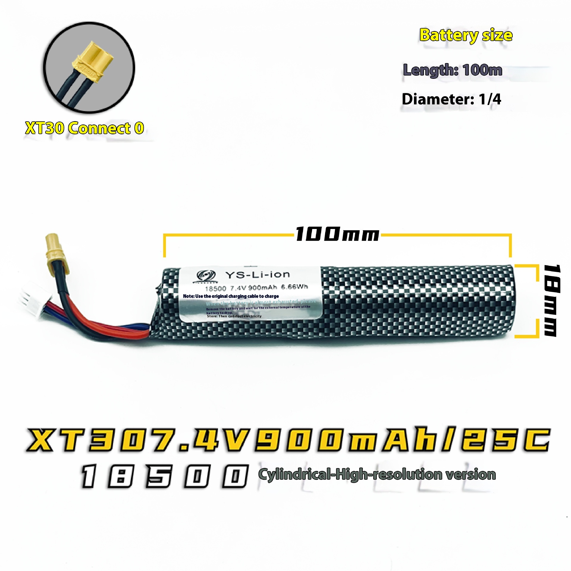 7.4V cylindrical 18500 high discharge version battery – XT30 900mAh/25C,