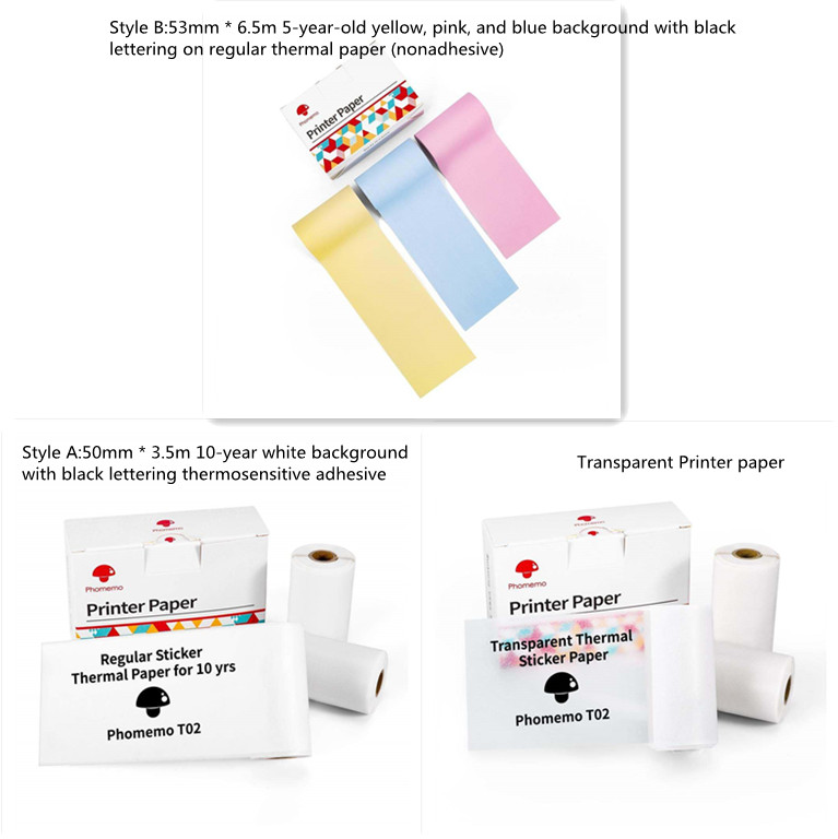 • Style B: 53mm * 6.5m 5-year-old yellow, pink, and blue background with black lettering on regular thermal paper (nonadhesive)