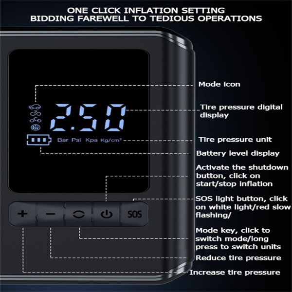 The Compact Tire Inflator stands out in a crowded marketplace due to its numerous advantages. One of its key benefits is the one-button preset tire pressure feature, which allows for full automation during inflation. This ensures that once you set the desired pressure, the device will automatically stop when that pressure is reached, preventing over-inflation and saving you time and effort. Additionally, the large LED digital display provides clear and precise readings, allowing you to monitor the inflation process with ease. The built-in LED lights enhance usability during nighttime operations, ensuring that you can inflate your tires in low-light conditions without any hassle. Its quick heat dissipation feature means that you can use it comfortably without worrying about burns or damage to your vehicle, making the Compact Tire Inflator an exceptional choice for customers seeking reliability and efficiency.