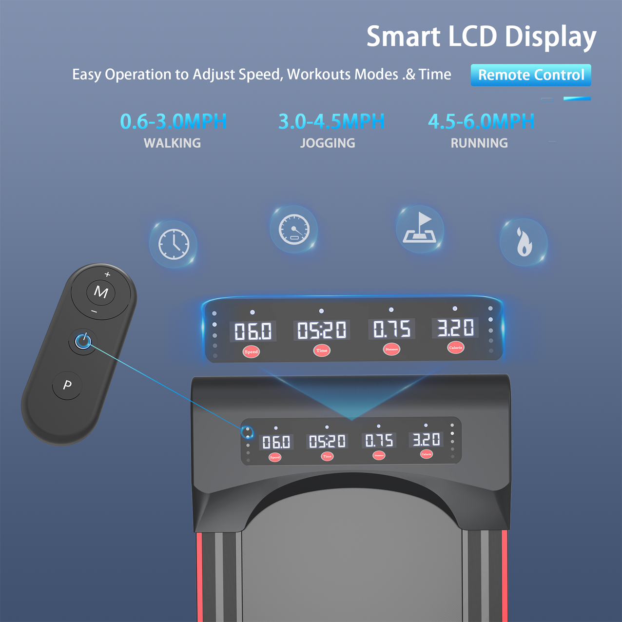 LED Display & Remote Control – You can monitor speed, distance, time, and calories in real-time via the LED display. This mini treadmill allows you to choose different speeds based on your physical condition and exercise regimen, offering a wide speed range of 0.6 – 5.0 mph.