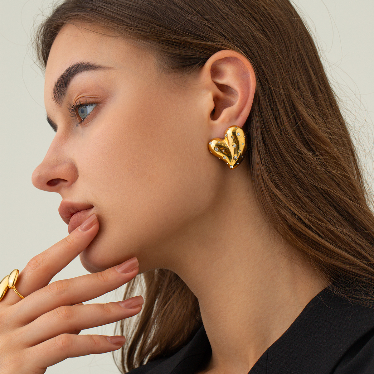 Introducing the Elegant 18K Gold Stainless Steel Heart Earrings with White Diamond Inlay, a stunning accessory that seamlessly combines sophistication and versatility. These earrings are ideal for a wide range of occasions, from casual outings to formal events. Whether you’re dressing up for a night out, attending a wedding, or simply looking to add a touch of elegance to your everyday attire, these earrings are the perfect choice.
