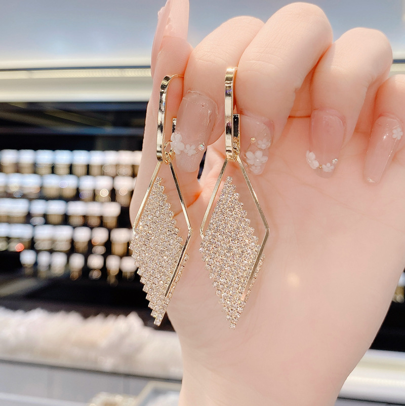 What sets these earrings apart is their unique blend of luxury and affordability. Crafted from high-quality materials, they offer a stunning look without breaking the bank. The fully-jeweled light luxury design, characterized by the dazzling full diamond rhombus shape, captures attention and reflects light beautifully. The use of thick real gold plating over copper enhances their aesthetic appeal while ensuring durability.