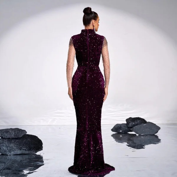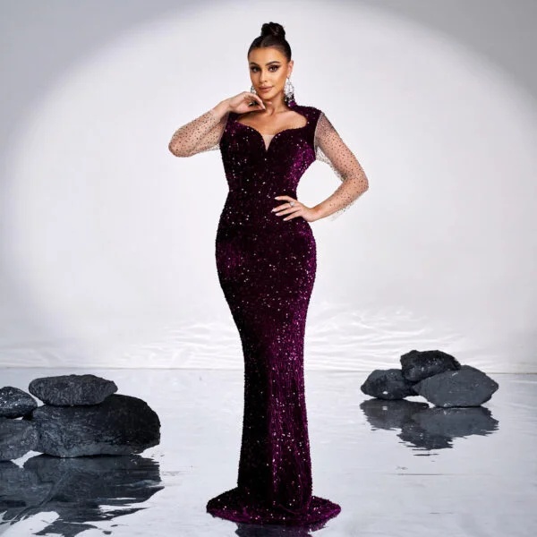 The high waist and long fishtail skirt create a flattering shape that enhances the wearer’s figure, while the sequined embellishments add a touch of sparkle, perfect for evening affairs. The dress is available in a captivating purple hue, which not only elevates its aesthetic appeal but also allows it to stand out in any crowd. Whether paired with strappy heels or statement jewelry, this dress is perfect for showcasing personal style in settings ranging from high-end restaurants to formal receptions.