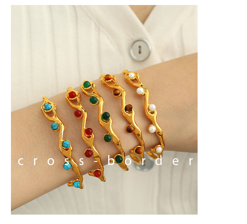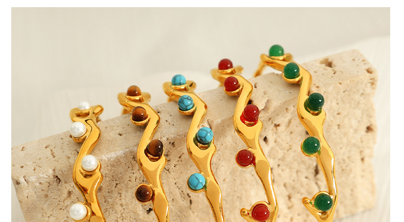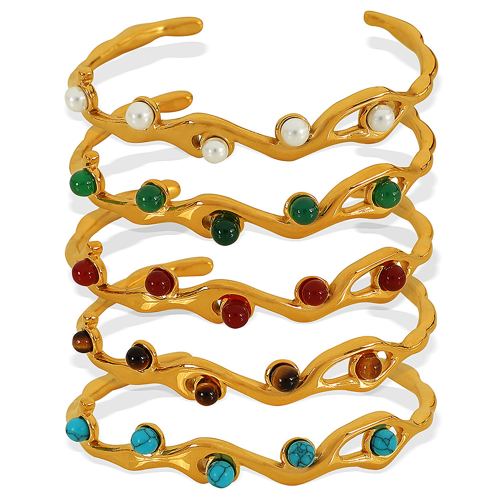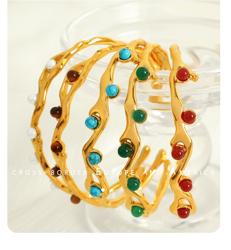 The French Retro Titanium Steel Bracelet with 18K Gold Plating and Natural Stone is a versatile accessory that finds its place in a variety of settings, making it an ideal choice for fashion-forward individuals. This bracelet is perfect for everyday wear, special occasions, or even as a thoughtful gift. Its exquisite design seamlessly complements both casual and formal outfits, allowing it to transition effortlessly from day to night. With options that include white pearl, red agate, tiger eye, turquoise, and green agate, customers can select a style that resonates with their personal aesthetic or matches specific outfits. This adaptability makes the bracelet suitable for various industries and contexts, including retail fashion, event planning, and personal gifting, while also appealing to jewelry enthusiasts who appreciate unique and stylish pieces.