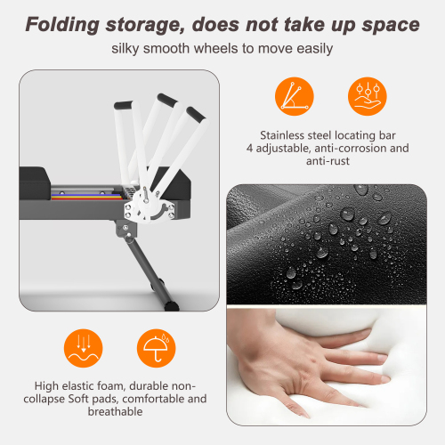 - Reformer Pilates Machine: The pilates machine measures 77.9″ L x 21.6″ W x 28.7″ H, with a weight capacity of 330.5lbs. Its folding design saves space in the home, and when stored, it measures 21.6″ L x 10.8″ W x 44″ H. The high-density sponge cushion is resistant to deformation, while the eco-silicone leather is easy to clean and resistant to cuts and scratches. It features ultra-smooth glide rails that accommodate various postures.