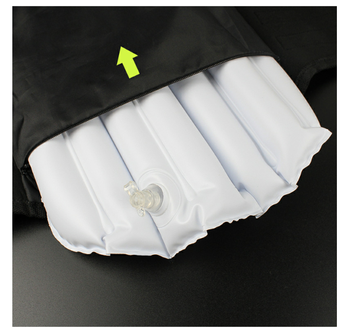 To inflate, remove the air nozzle from the airbag, open the air nozzle cover, insert the air tube into the air tube, and press it firmly against the swimming ring air nozzle, pinching it securely with your fingers, then inflate slowly.