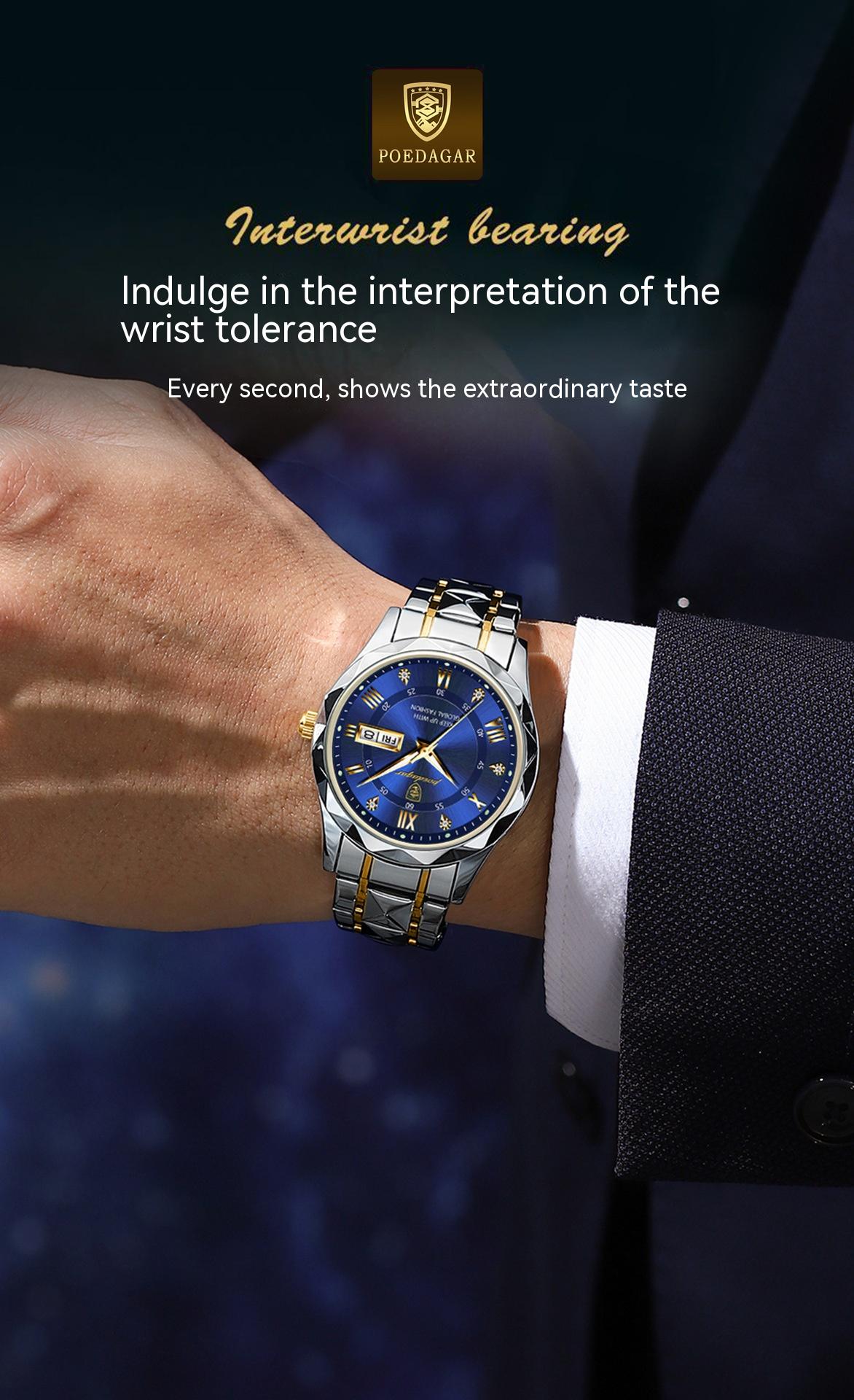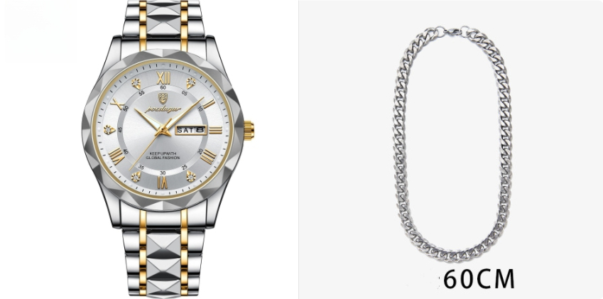 The advantages of the Men’s Luminous Quartz Watch are numerous, contributing to its status as a must-have accessory. One of its standout features is the luminous function, which ensures visibility in low-light conditions, making it perfect for evening events or nighttime outings. The double calendar function is another significant benefit, providing users with the day and date at a glance, thus enhancing usability and convenience. The watch is crafted from high-quality metal, ensuring durability and a premium feel that sets it apart from other timepieces in the market. Its various color options—including black and gold, gold and blue, gold and white, and silver combinations—allow users to select a style that best fits their personal aesthetic. The combination of these features not only enhances the watch’s functionality but also makes it an attractive choice for discerning customers who value both form and performance.