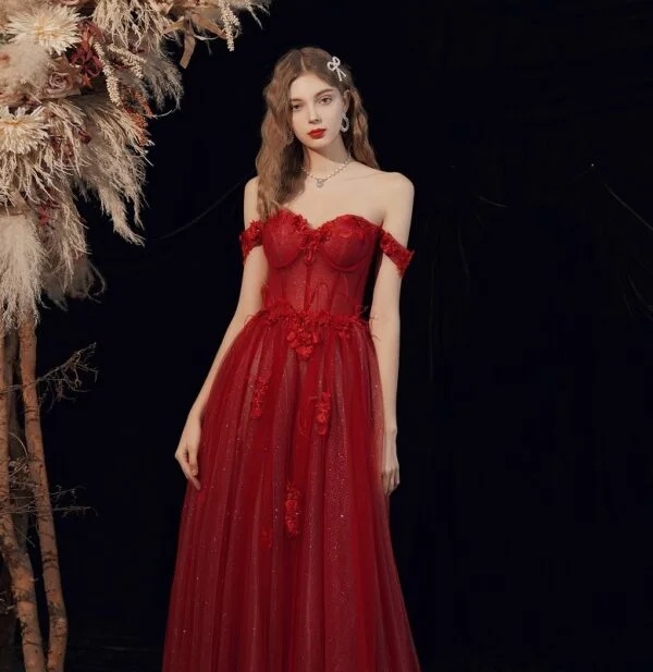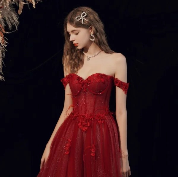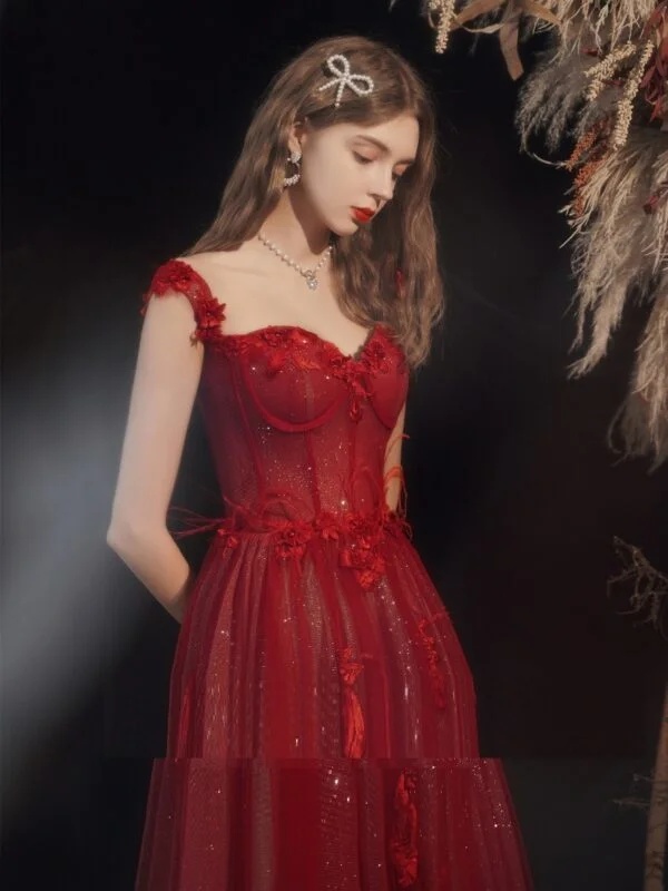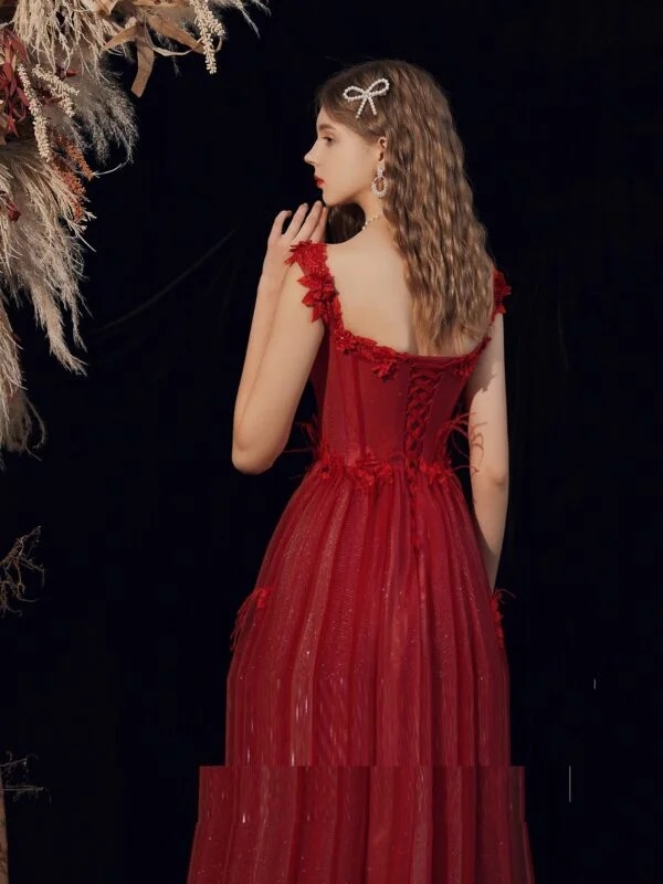 The dress features a chic straight shoulder style and popular straps that add a contemporary touch, making it suitable for both traditional and modern settings. Available in an attractive wine red color, the dress can easily transition from a wedding toast to a formal dinner or corporate event. Its unique design and color make it a perfect choice for women who want to stand out and exude confidence, whether in a professional meeting, a celebratory toast, or any elegant occasion.