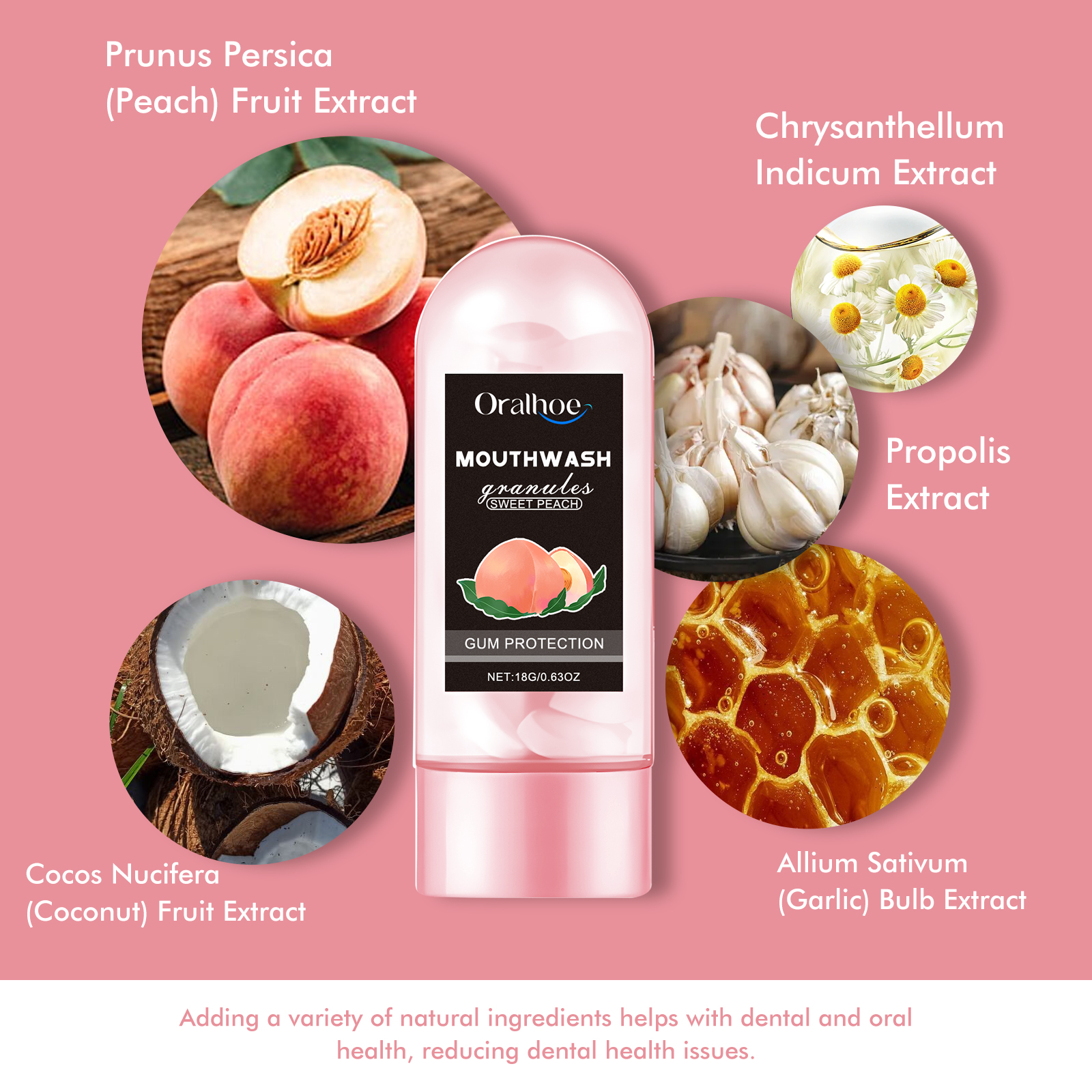 Our Peach Flavor Teeth Cleaning and Rinsing Granules feature peach fruit extract, garlic extract, and propolis extract. They effectively eliminate plaque and stubborn tartar, restore whiteness and health to teeth, alleviate discomfort from mouth ulcers, promote healing of ulcers, and minimize pain. The usage is straightforward: when you want to clean your mouth, take 1~2 tablets, chew until your mouth is filled with foam, clean your teeth using a toothbrush, spit out the foam after rinsing your mouth, and then rinse your mouth with water. This product supports teeth and oral health while reducing dental health issues.