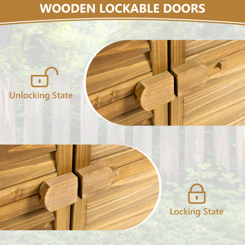 - Solid Structure: Our storage shed is made of solid fir wood and painted in natural wood color to ensure that it can still hold up well in bad weather. To ensure the stability of the product, you need to place the small house on a flat surface.