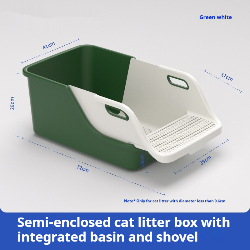 The Semi-Enclosed Integrated High Splash-Proof Cat Litter Box is designed for pet owners seeking an efficient and clean solution for managing their feline companions’ waste. This innovative litter box is suitable for various settings, including homes, apartments, and veterinary clinics, where cleanliness and ease of use are paramount. Its semi-enclosed design allows for privacy while also preventing litter from scattering outside the box, making it ideal for cats that prefer a more secluded space. The integrated basin and shovel feature streamline the cleaning process, allowing for quick and hassle-free maintenance.