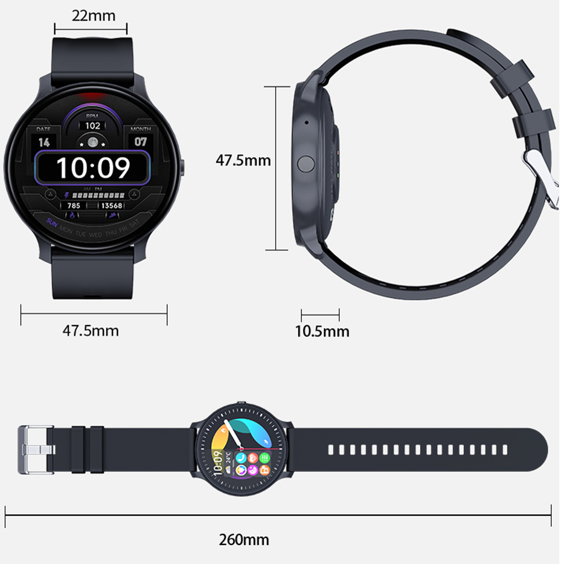 - Functions: Waterproof, step counting, heart rate monitoring, social entertainment, Bluetooth calling, smart reminder