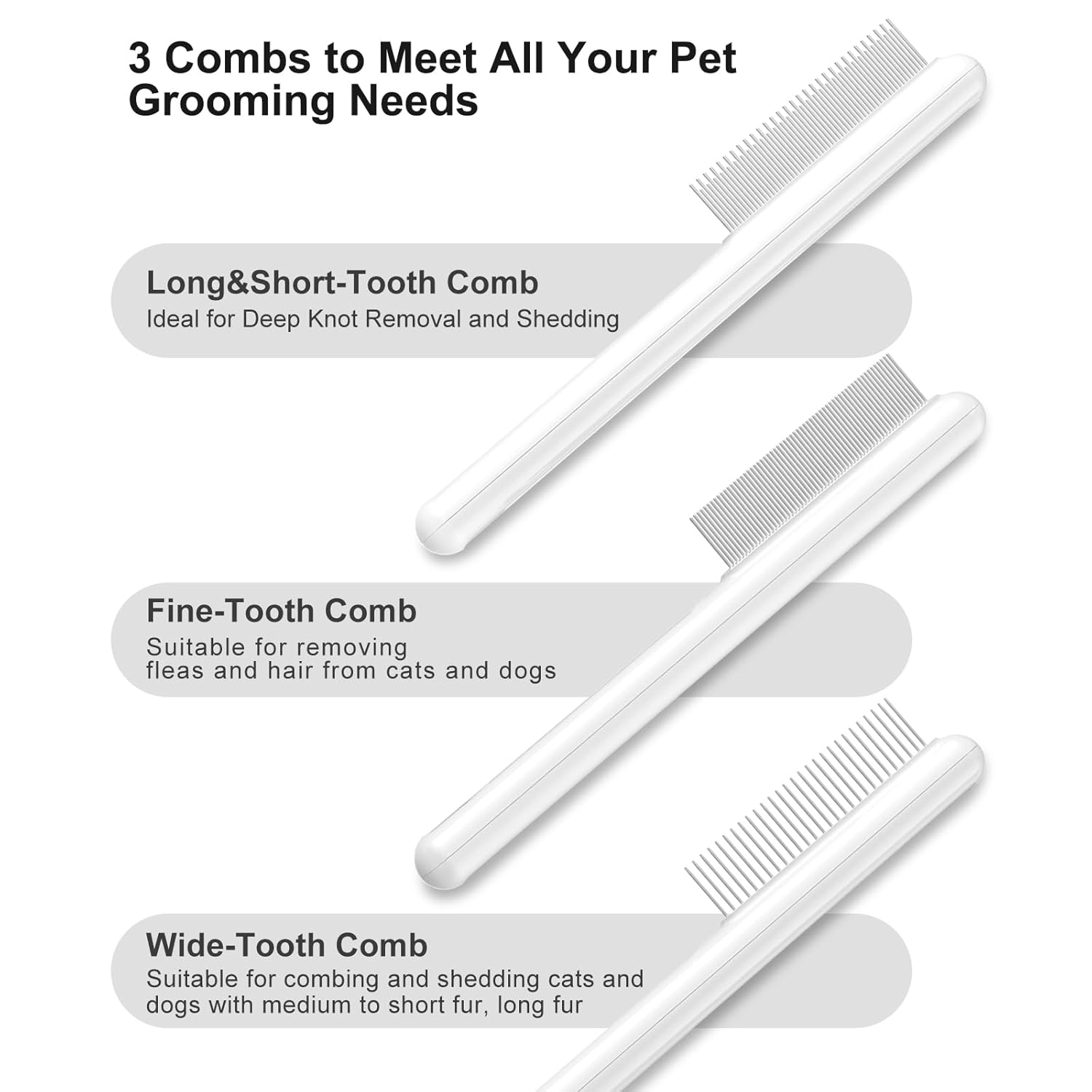 Suitable for various types of pets, regardless of whether they have long or short hair. They are versatile enough to accommodate different grooming needs, making them an essential tool for maintaining your pet’s hygiene. They also serve as effective massaging tools. Good long hair cat comb and short hair cat comb options for you.