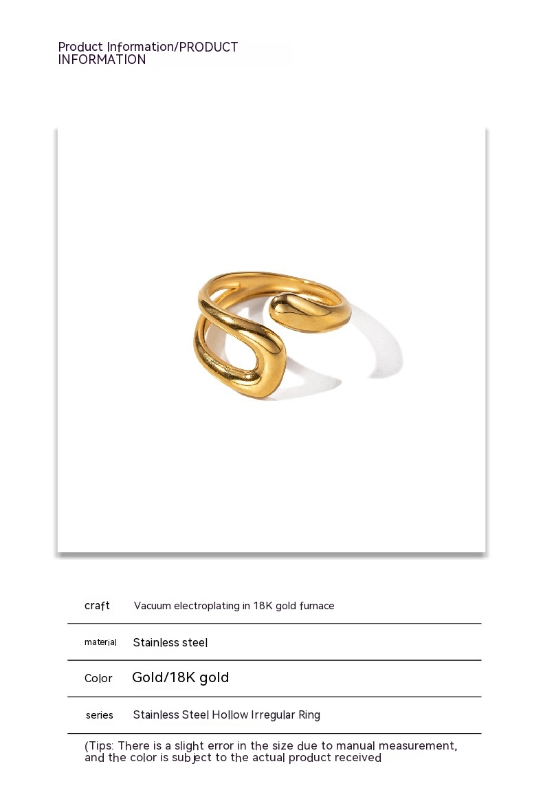 Quality is a paramount consideration in the design and manufacturing of the Stylish Classic Retro INS-Inspired Ring. The use of premium stainless steel guarantees that the ring is not only visually appealing but also robust and resistant to wear and tear. The craftsmanship involved in creating the hollow, irregular structure of the ring showcases attention to detail, ensuring that each piece meets high standards of quality and aesthetic appeal. This commitment to excellence means customers can trust in the longevity of their purchase, enjoying the ring for years to come. The product adheres to strict quality assurance standards, providing peace of mind that each ring is made to last while maintaining its fashionable edge.