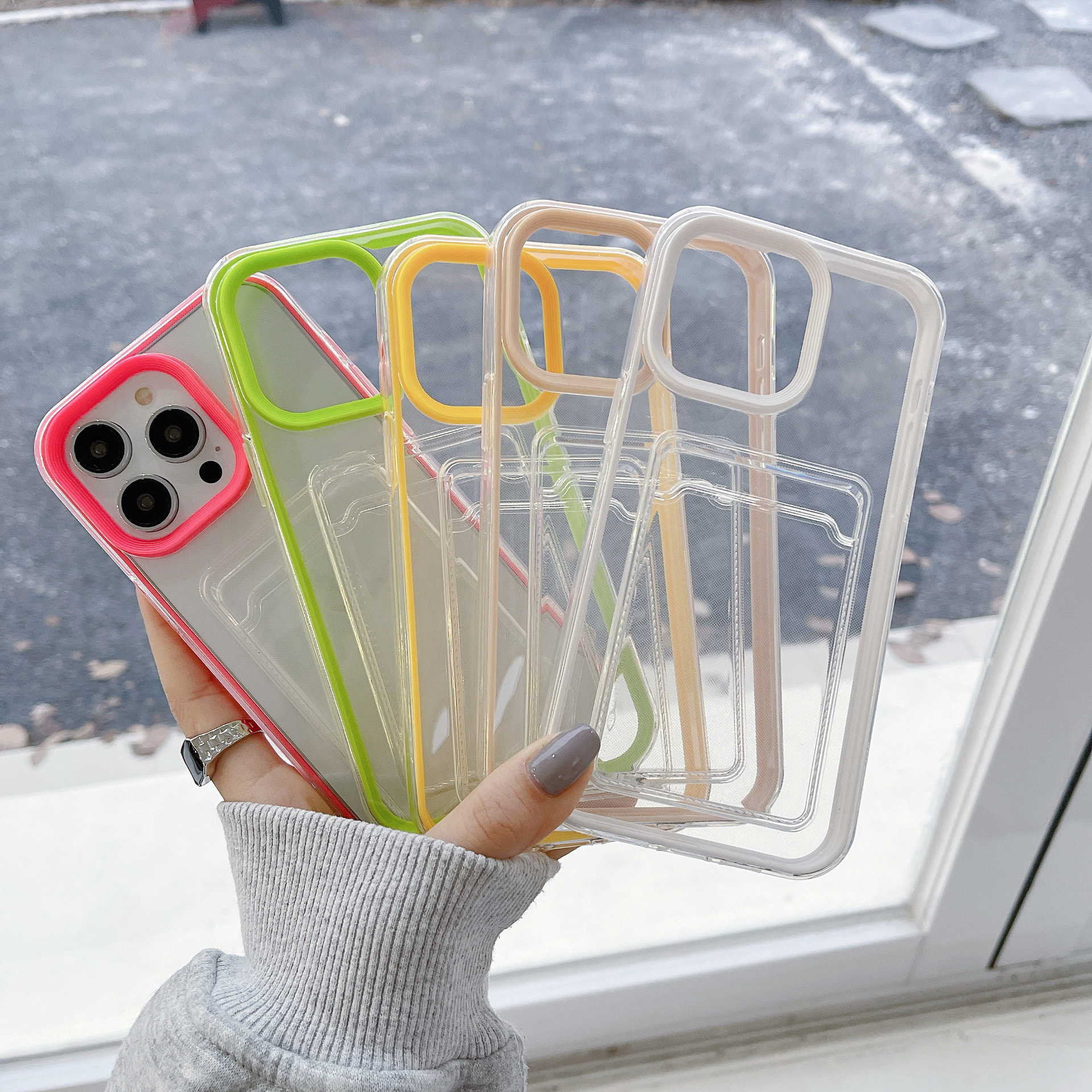 The advantages of the Stylish Solid Color Three-in-One Transparent Card Insert Phone Case extend beyond mere aesthetics. Crafted from durable TPU material, this phone case provides excellent anti-fall protection, ensuring the safety of the device against accidental drops and impacts. Its all-inclusive design encompasses the phone completely, safeguarding it from scratches, dirt, and daily wear and tear.