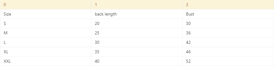 Size: S back length 20 (recommended 2-3 jin), M back length 25 (recommended 4-5 jin), L back length 30 (recommended 6-8 jin), XL back length 35 (recommended 9-11 Jin), XXL back length 40 (recommended 12-18 Jin)