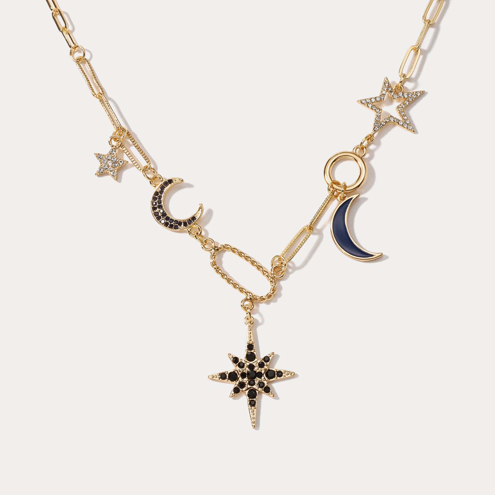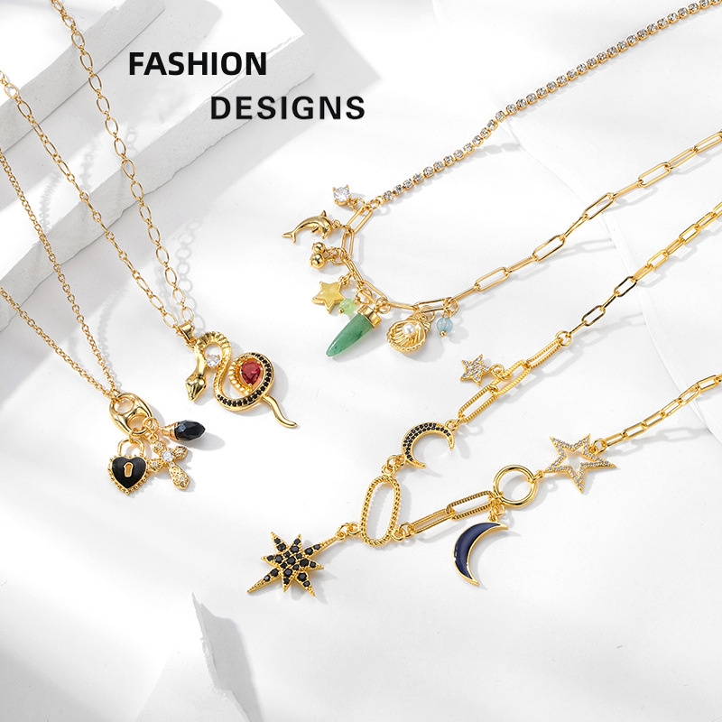 The Trendy Copper-Plated Gold Necklace with Star and Moon Rhinestone Alloy Design is a captivating accessory that seamlessly fits into a variety of settings and occasions. This necklace is particularly well-suited for women seeking to enhance their personal style while embracing a touch of celestial elegance. The unique star and moon design makes it an ideal choice for casual outings, formal events, and everything in between. Whether dressing up for a special occasion or adding flair to everyday attire, this trendy piece serves as a versatile statement accessory. Its lightweight and comfortable wearability ensure that it can be enjoyed throughout the day, making it a perfect addition to any jewelry collection. The necklace is designed to complement a range of fashion styles, from bohemian to chic, allowing individuals to express their unique personalities and tastes.
