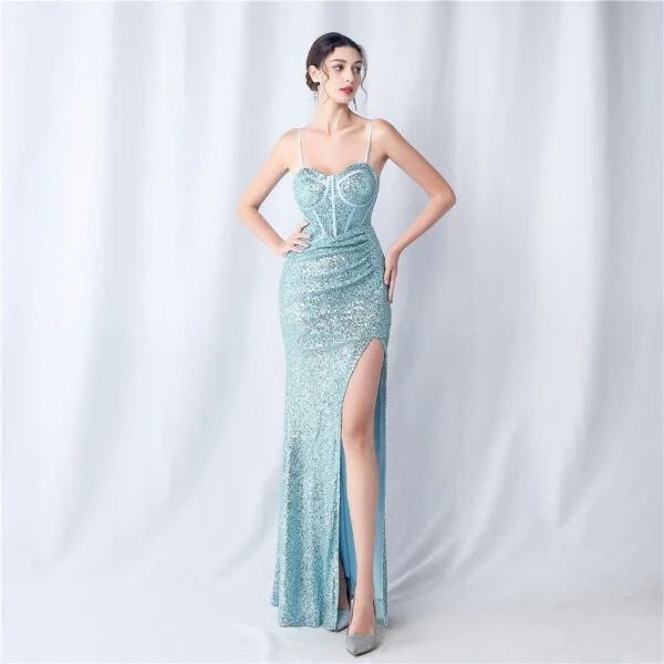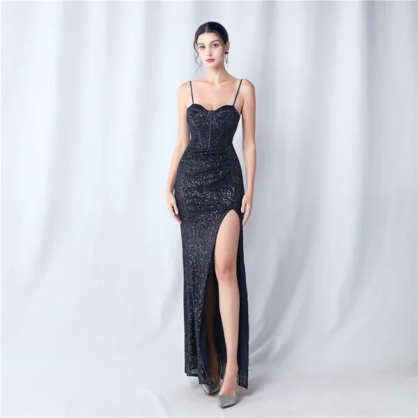 The Vibrant Sequin Side Slit Long Camisole Evening Dress is an exquisite choice for a wide range of special occasions. This dress is specifically designed for ladies attending banquets, parties, or any glamorous evening event where one wants to make a striking impression. With its elegant sequin embellishments and stylish side slit, this dress stands out in a variety of settings, from formal gatherings to upscale dinners. Its versatility allows it to be worn across different industries and occasions, making it suitable for everything from corporate events to social celebrations. Available in an array of stunning colors, including sky blue, black, dark blue, apricot, silver, green, gold, and wine red, this dress caters to a diverse palette, ensuring that every woman can find her perfect match to express her unique style.